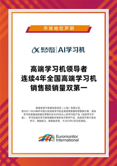 在科技与教育深度融合的当下,高端学习机市场正迎来蓬勃发展的黄金时期。欧睿于2025年3 - 4月开展的系统市场调研显示,科大讯飞凭借卓越表现,夯实了其“全国高端学习机领导者”的地位,连续4年实现全国高端学习机销售额与销量的双第一。